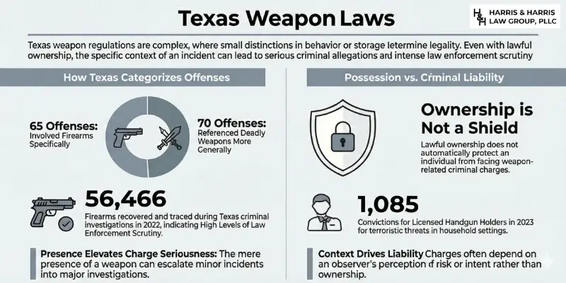 Weapon laws in Texas are complicated, and misunderstandings are common. Harris & Harris Law Group, PLLC, is here to bring clarity to your complicated legal matter. Contact us today to learn more about our history in this space and what services we can offer to help.